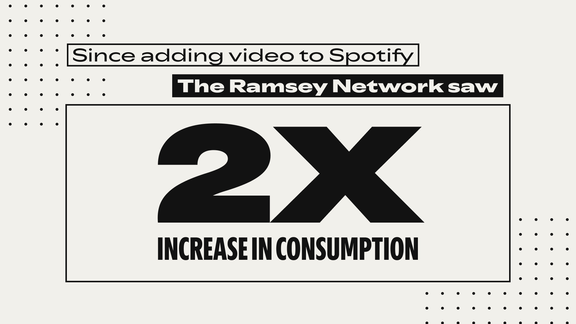 - The Ramsey Network's consumption hours have doubled and their audience has grown over 400% on Spotify this year to date since rolling out video across their slate of shows.