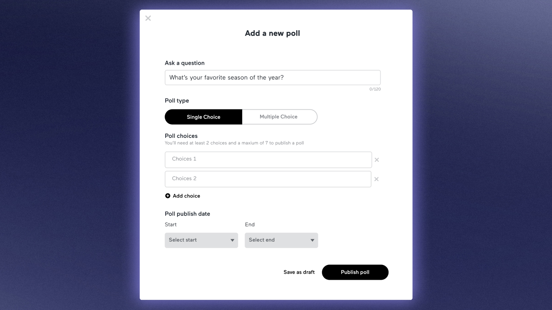 Creating polls is also simple. Just add your question and create up to seven options for your listeners to choose from (you can even choose between single select or allow listeners to select multiple options). You can control how long the poll runs for; the real-time responses will display during that time frame, and the final results will appear on your episode page after it closes.