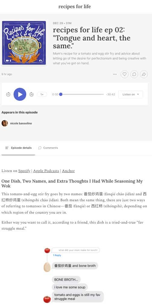 In the example below, Nicole shares a text message exchange about the meal featured in one of her episodes above the recipe. This adds a personal touch for her subscribers and helps them get to know her better.