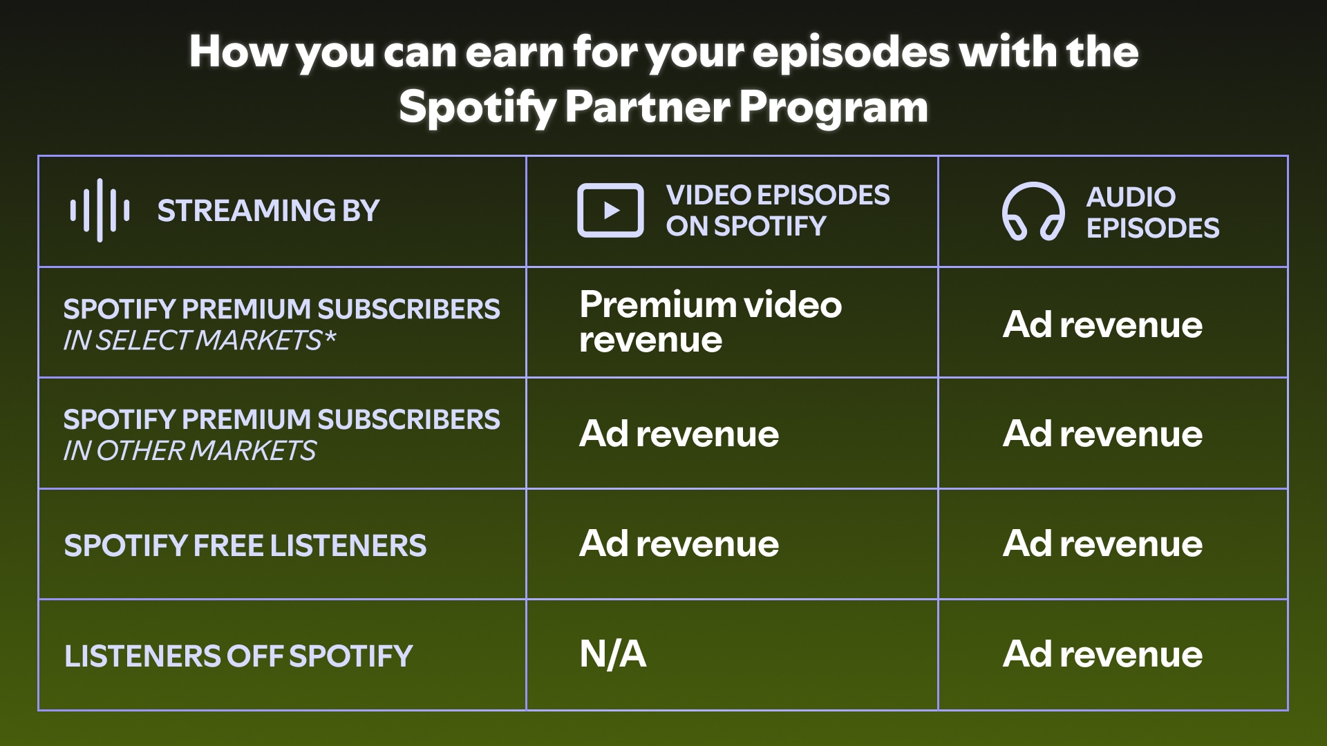 People who are not Spotify Premium subscribers in these markets, or people who listen to any non-video episodes you may publish on or off-Spotify, will still be able to stream your episodes with dynamic ads, and you can continue to earn revenue for any ads that play on those episodes.