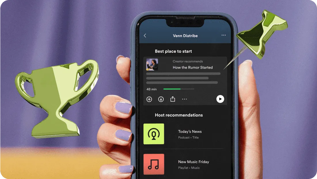 Guide new listeners to your “Best place to start” episode to maximize the chances of gaining a loyal fan. Then cross-promote, self-promote, or just share some of your favorite content from anywhere on Spotify with “Host recommendations”.